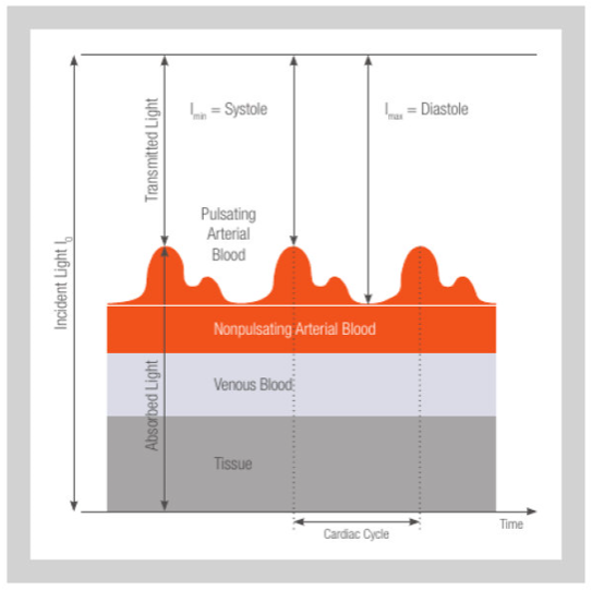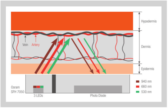 传感器发射绿光、红光或红外光,这些光照射皮肤或组织并被吸收或反射。检测器所记录的反射光量,随动脉中的血量而变化(光电容积描记)。对于手腕部位,通过绿光进行测量;对于手指部位,则使用红光波长或红外波长进行测量。