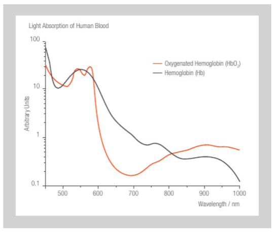 血液(更准确地说应该是血液色素血红蛋白 (Hb))的吸收行为随吸氧量而变化(氧合血红蛋白或 HbO2)。通过测量红光和红外光的吸收,可测定血氧饱和度。